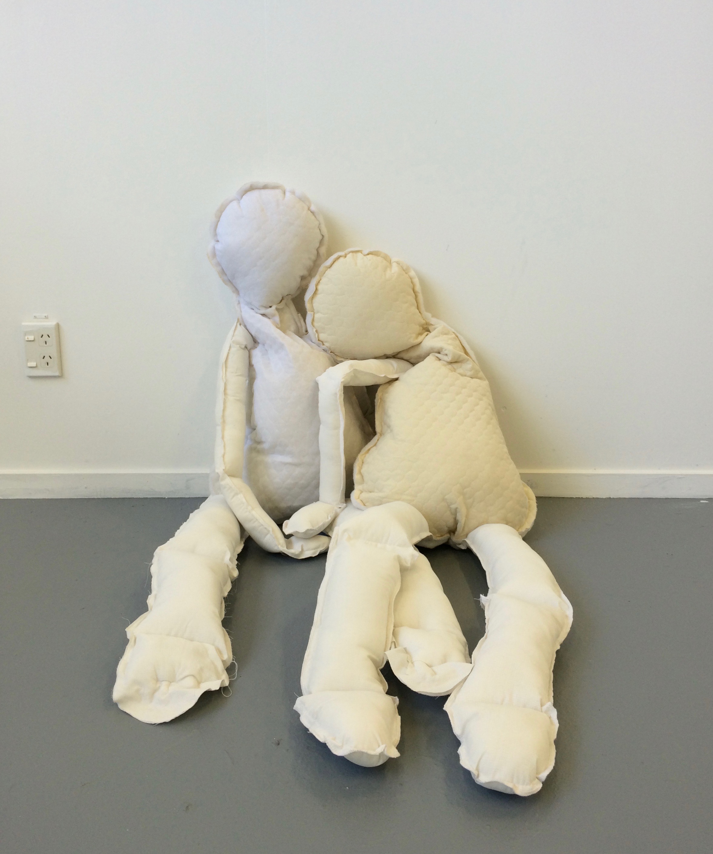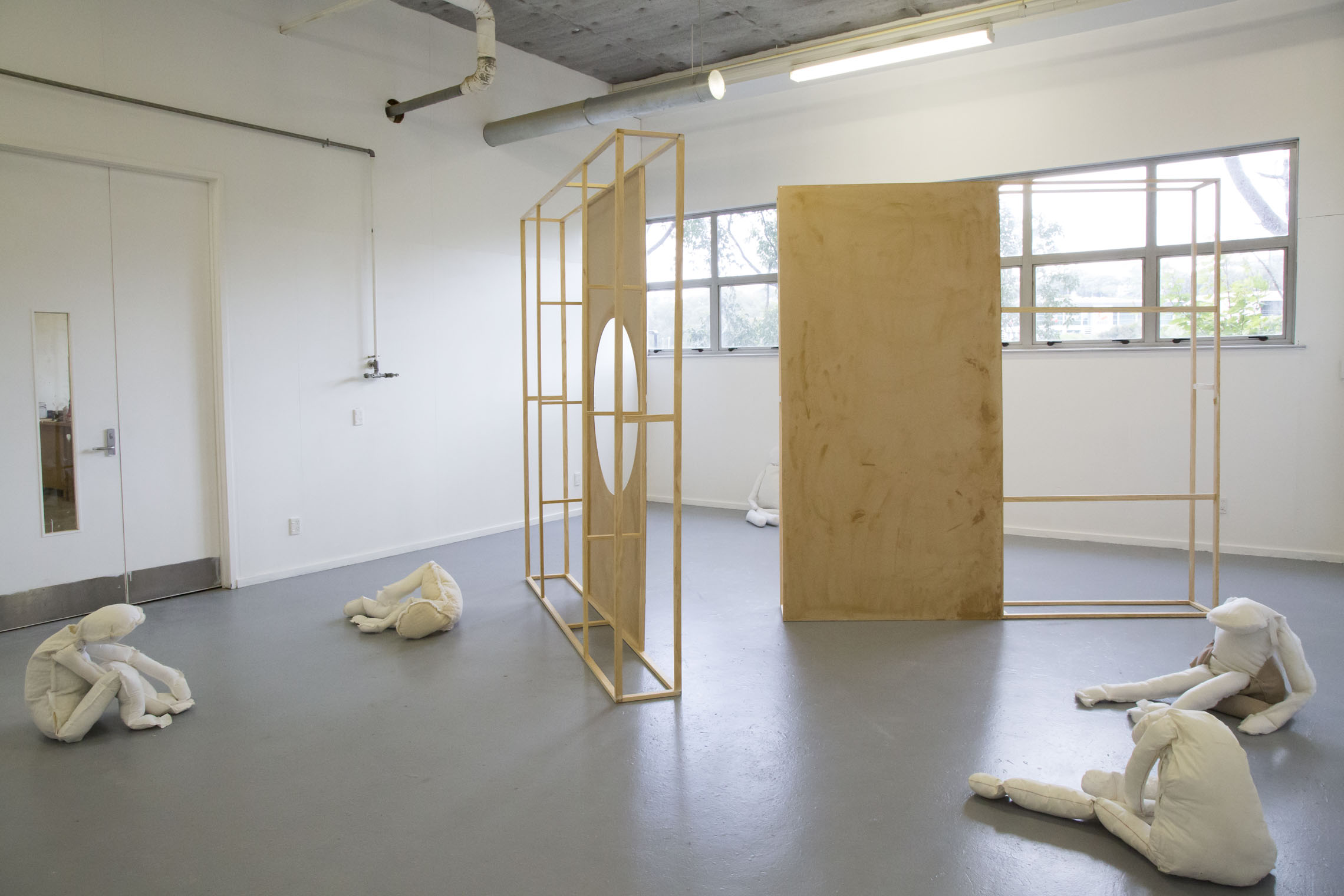 This installation measures the human body against architectural structures — frames that both define and confine space. Within these large wooden forms, soft, slumped figures occupy positions of strain, rest, and quiet endurance. Their fabric bodies are fragile, unguarded, and persistently human in contrast to the rigid precision surrounding them.The work explores the tensions between vulnerability and resilience, between the frameworks that shape us and the bodies that resist. It reflects the conditioning that governs social identity — how we learn to move, to perform, to “fit” within invisible systems of expectation.As a twin, this examines mirrored existence and shared formation — how identity is built in relation to another, and how individuality is negotiated within closeness. The installation becomes both a personal and universal confidence course: a passage through which one’s sense of self is tested, stretched, and ultimately redefined.